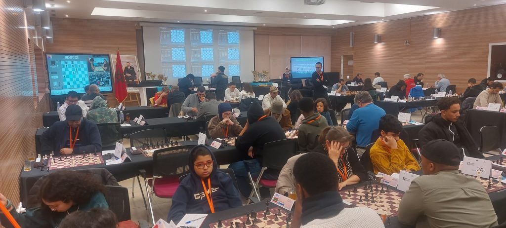 فعاليات الجولة الثانية ، اليوم الثاني 7 دجنبر 2025 من البطولة الفرنكفونية للشطرنج في دورتها 11 المنظمة من طرف الجمعية الفرنكفونية للشطرنج بشراكة مع الجامعة الملكية المغربية للشطرنج و العصبة الجهوية للشطرنج مراكش-آسفي مؤسسة مراكش 21و ذلك بكلية اللغات جامعة القاضي عياض بمراكش