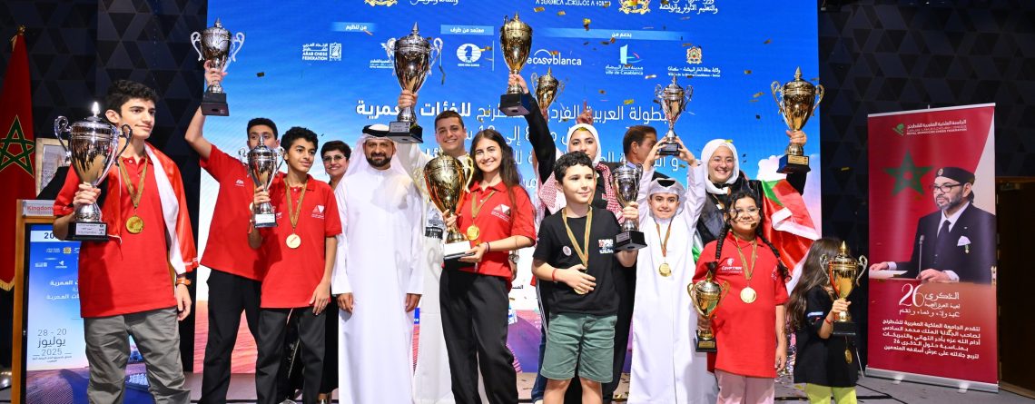 تتقدّم الجامعة الملكية المغربية للشطرنج بجزيل الشكر والتقدير لكافة الشركاء المؤسساتيين، والوزارات، والمؤطرين، والأندية، على مساهمتهم الفاعلة في نجاح البطولات العربية للفئات العمرية سنة 2025.