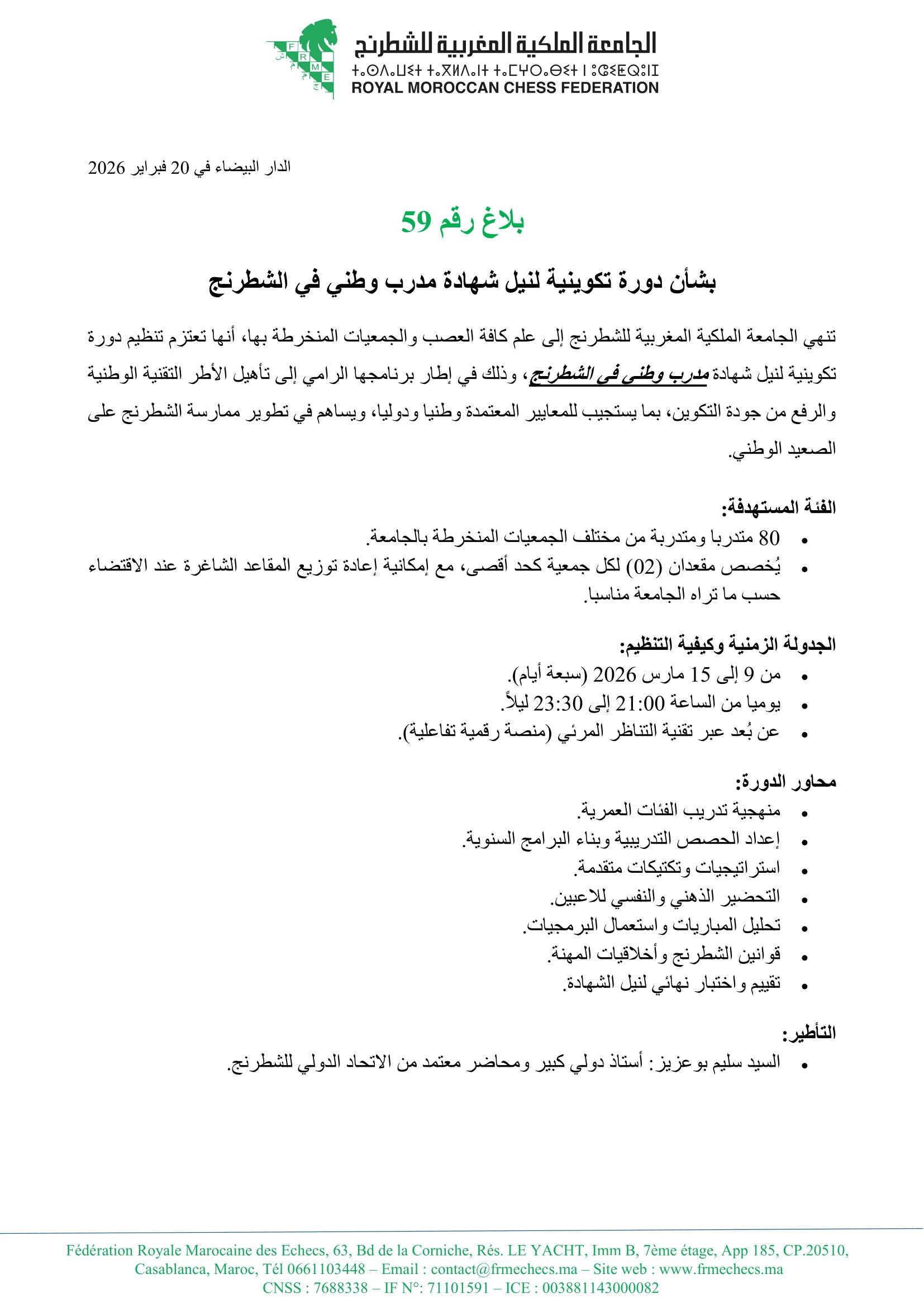بلاغ رقم 59 بشأن دورة تكوينية لنيل شهادة مدرب وطني في الشطرنج