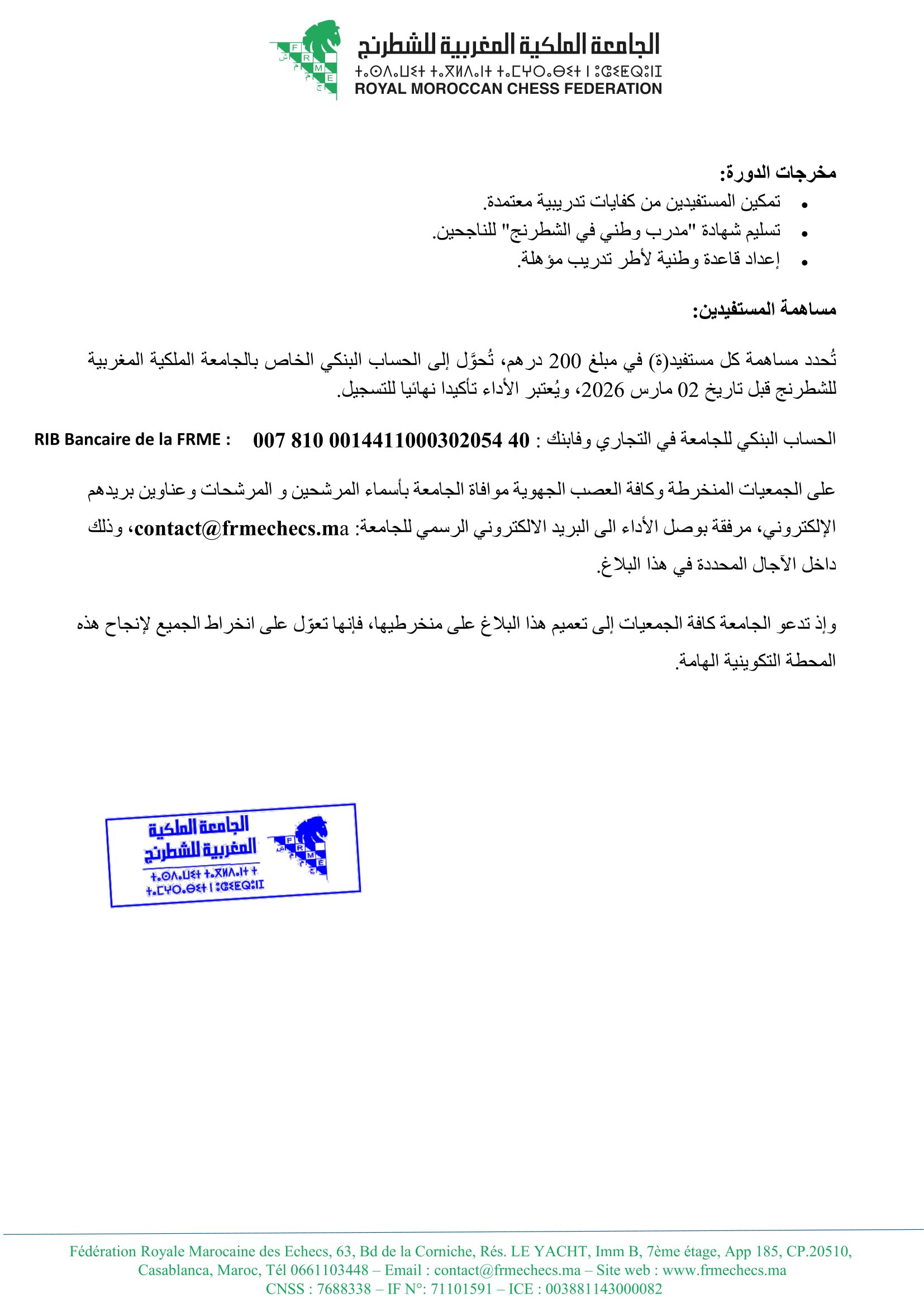 تنهي الجامعة الملكية المغربية للشطرنج إلى علم كافة العصب والجمعيات المنخرطة بها، أنها تعتزم تنظيم دورة تكوينية لنيل شهادة مدرب وطني في الشطرنج، وذلك في إطار برنامجها الرامي إلى تأهيل الأطر التقنية الوطنية والرفع من جودة التكوين، بما يستجيب للمعايير المعتمدة وطنيا ودوليا، ويساهم في تطوير ممارسة الشطرنج على الصعيد الوطني.