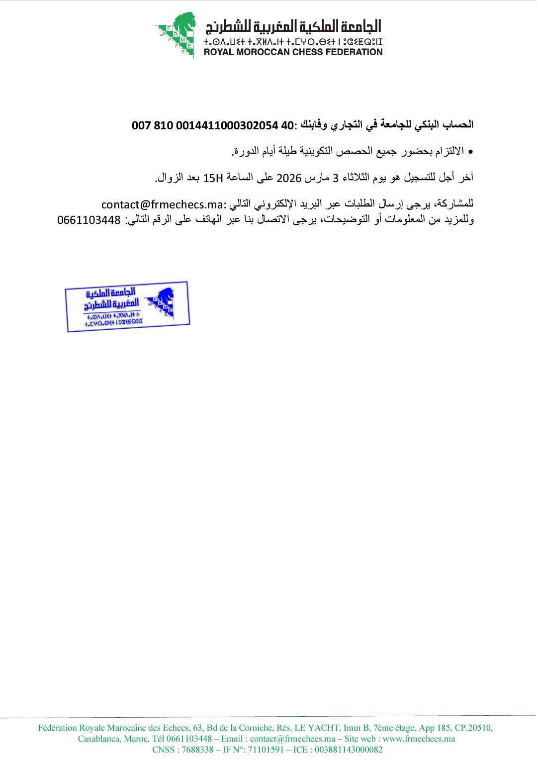 آخر أجل للتسجيل هو يوم الثلاثاء 3 مارس 2026 على الساعة 15H بعد الزوال.