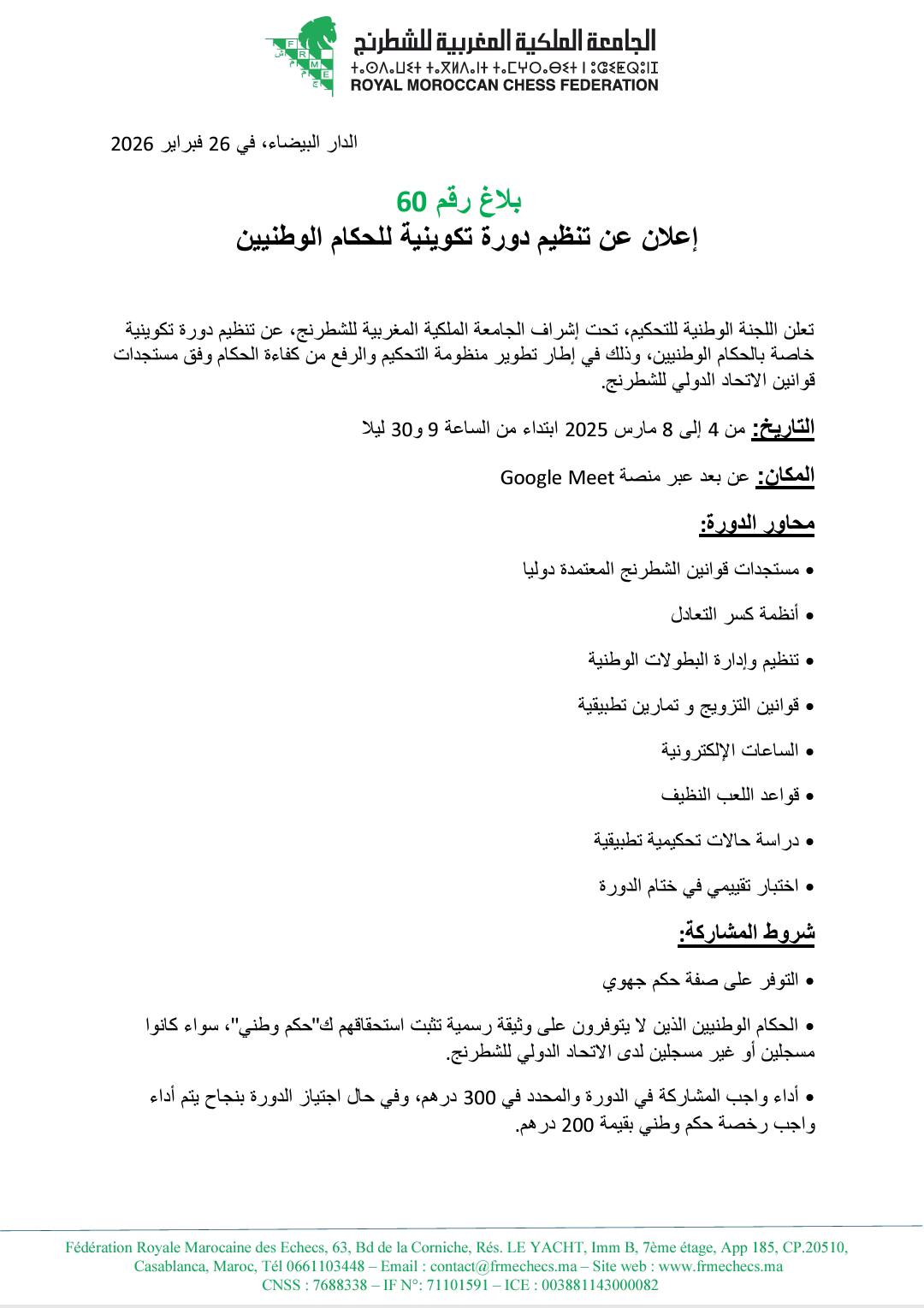 تعلن اللجنة الوطنية للتحكيم، تحت إشراف الجامعة الملكية المغربية للشطرنج، عن تنظيم دورة تكوينية خاصة بالحكام الوطنيين، وذلك في إطار تطوير منظومة التحكيم والرفع من كفاءة الحكام وفق مستجدات قوانين الاتحاد الدولي للشطرنج.
