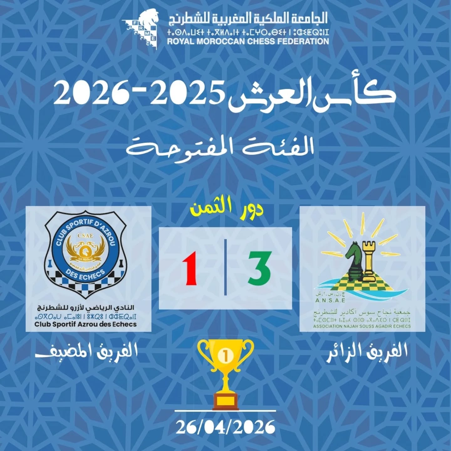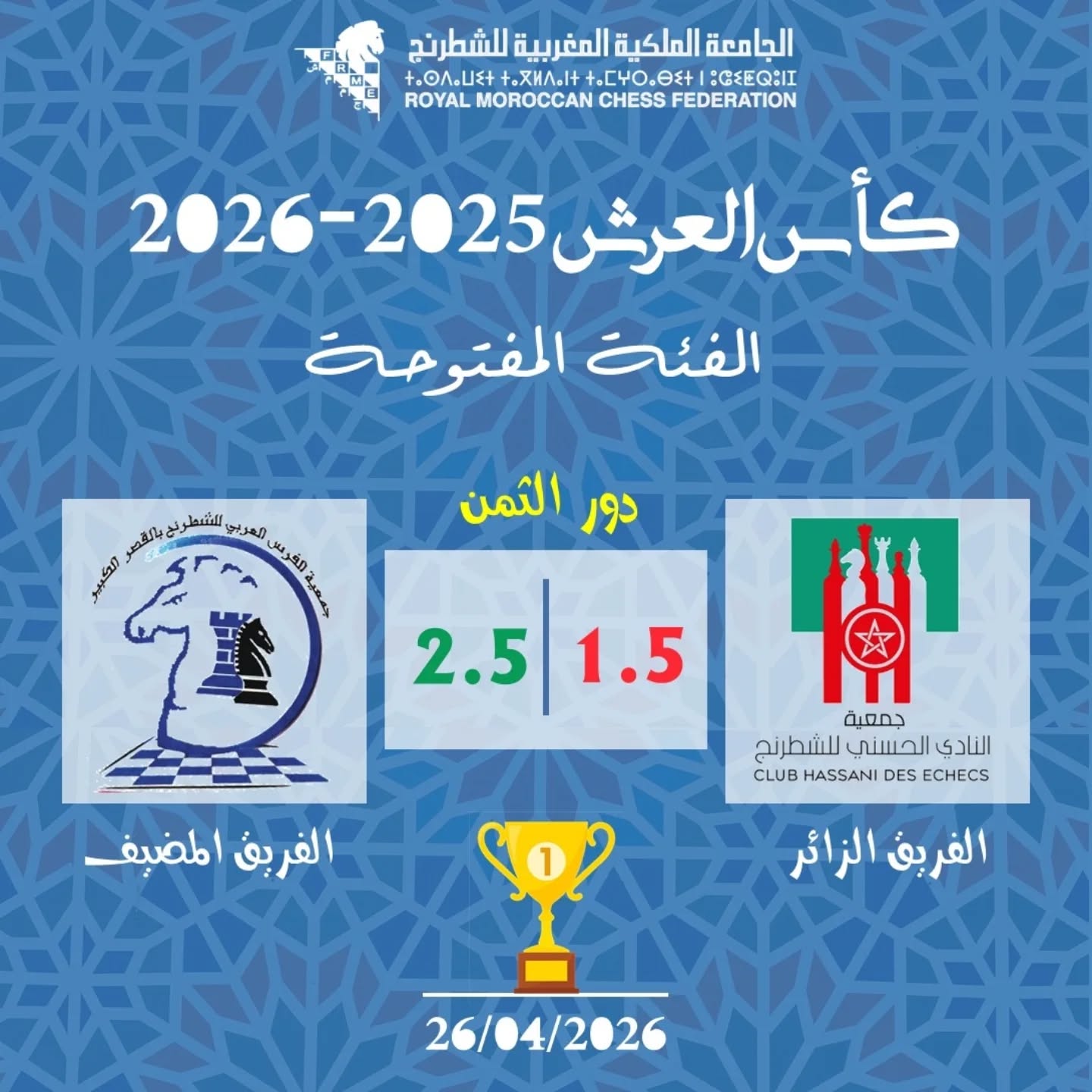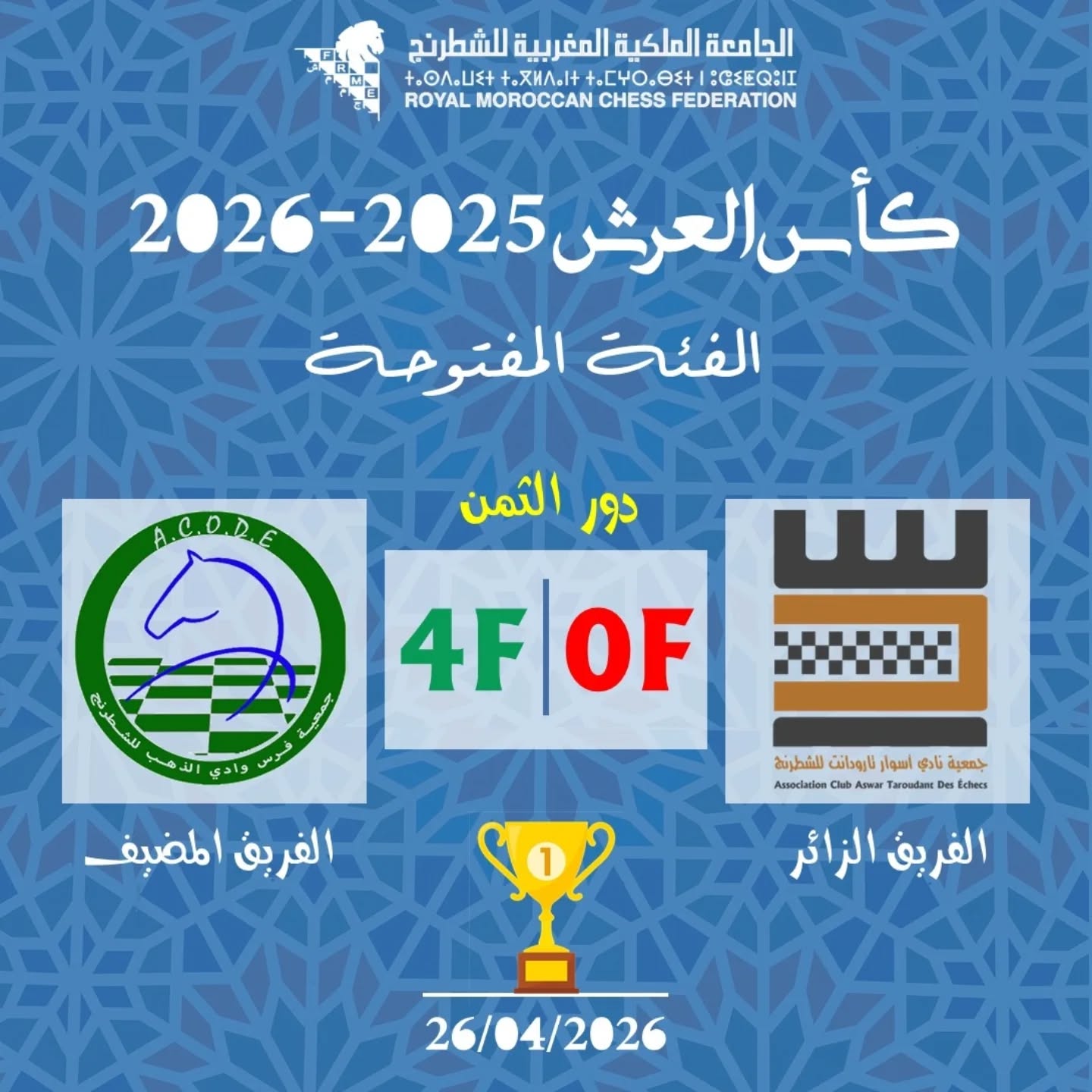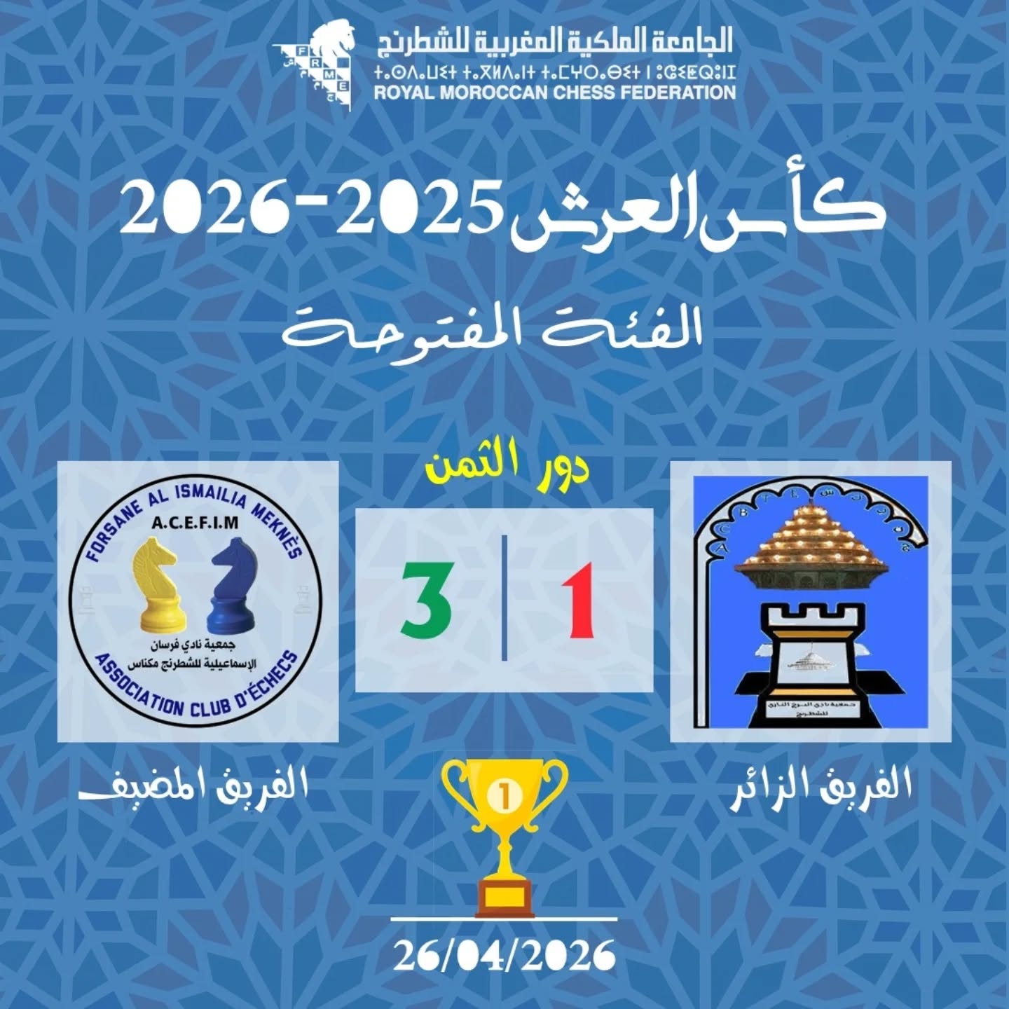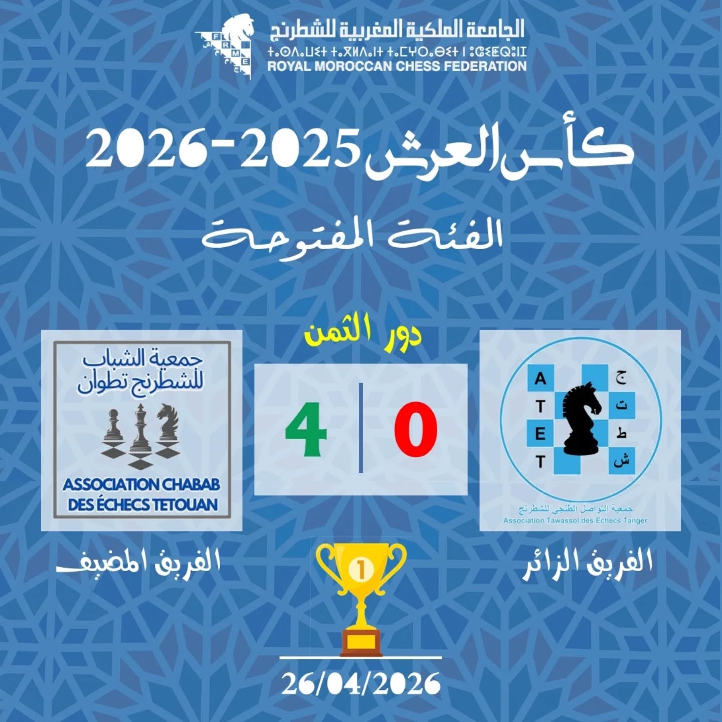 الفرق المؤهلة لدور النصف هم : 1_ جمعية الشباب للشطرنج تطوان. 2_ جمعية الليمون للشطرنج بركان. 3_ جمعية النادي الرياضي لازرو للشطرنج. 4_... إقرأ المزيد...