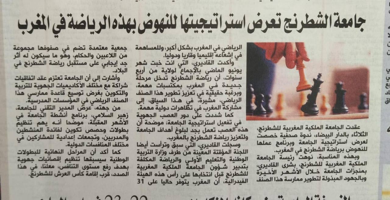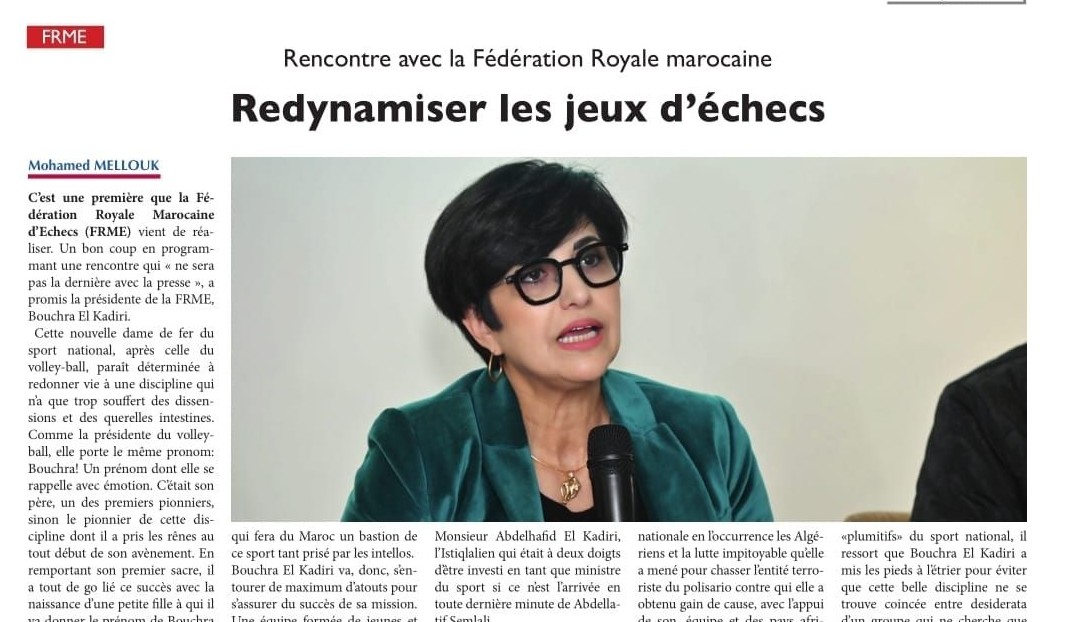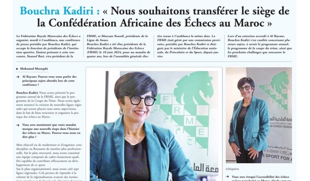 شعلة بريس : بشرى القادري تفي بوعدها: الشطرنج يدخل المدارس لتعزيز التفكير لدى التلاميذ ومنافسة كرة القدم في شعبية الشباب.