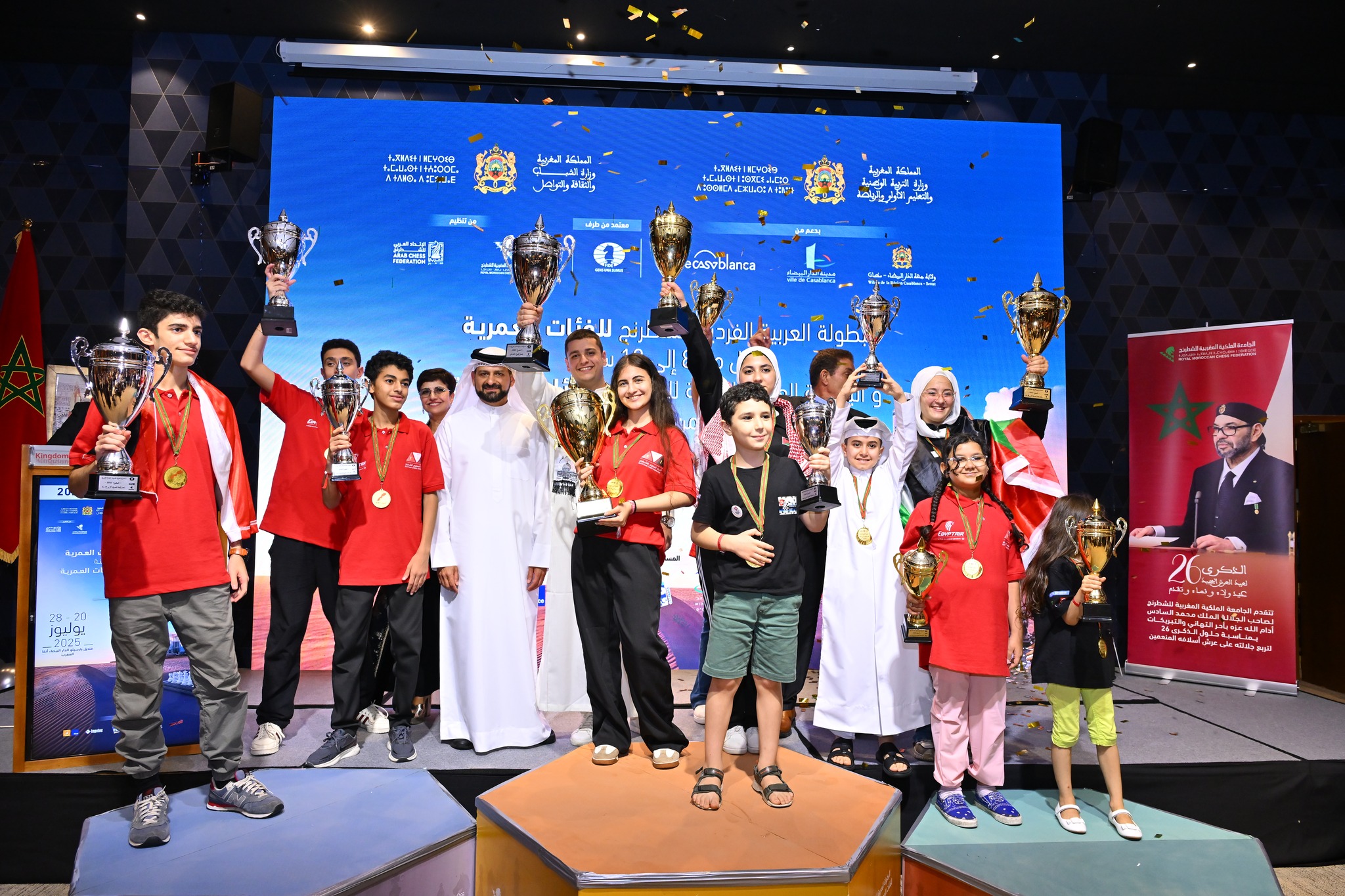 تتقدّم الجامعة الملكية المغربية للشطرنج بجزيل الشكر والتقدير لكافة الشركاء المؤسساتيين، والوزارات، والمؤطرين، والأندية، على مساهمتهم الفاعلة في نجاح البطولات العربية للفئات العمرية سنة 2025. بفضل هذا التعاون المثمر، نجح المغرب في تنظيم تظاهرة رياضية عربية متميزة جمعت بين التنافسية وروح الأخوة.